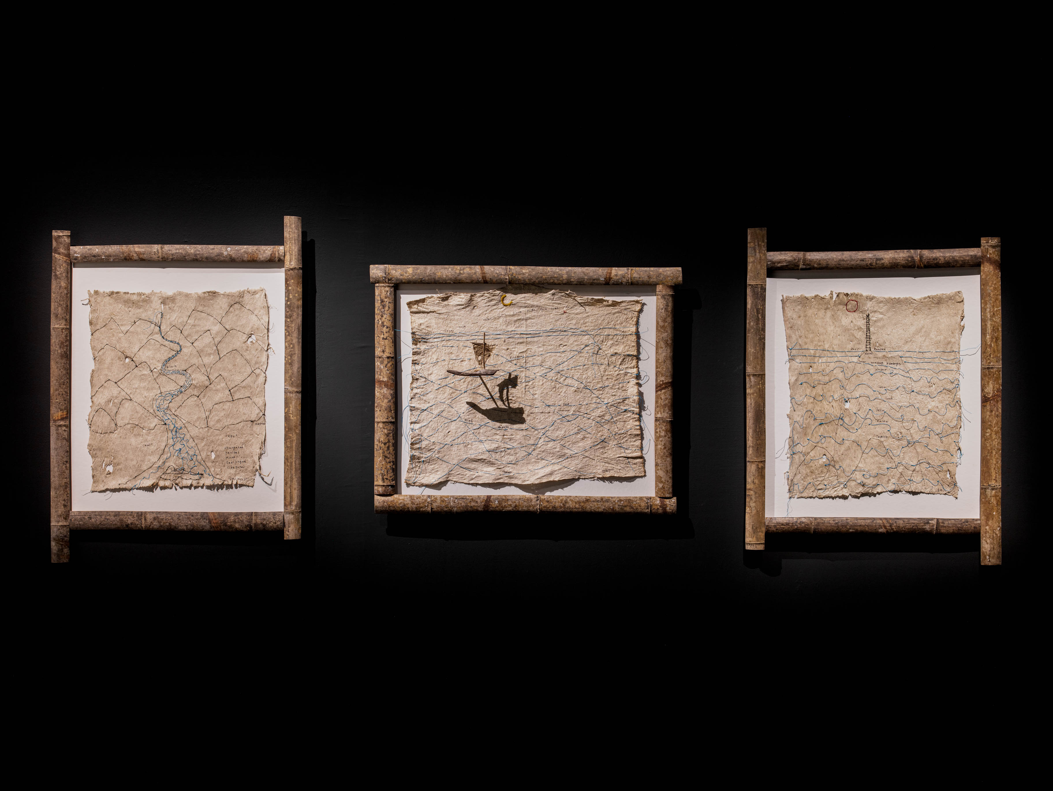 2020,構樹皮、木、海廢魚線、布線、油性簽字筆,53×47cm(左) 56×63×8cm(中) 56×47cm(右)