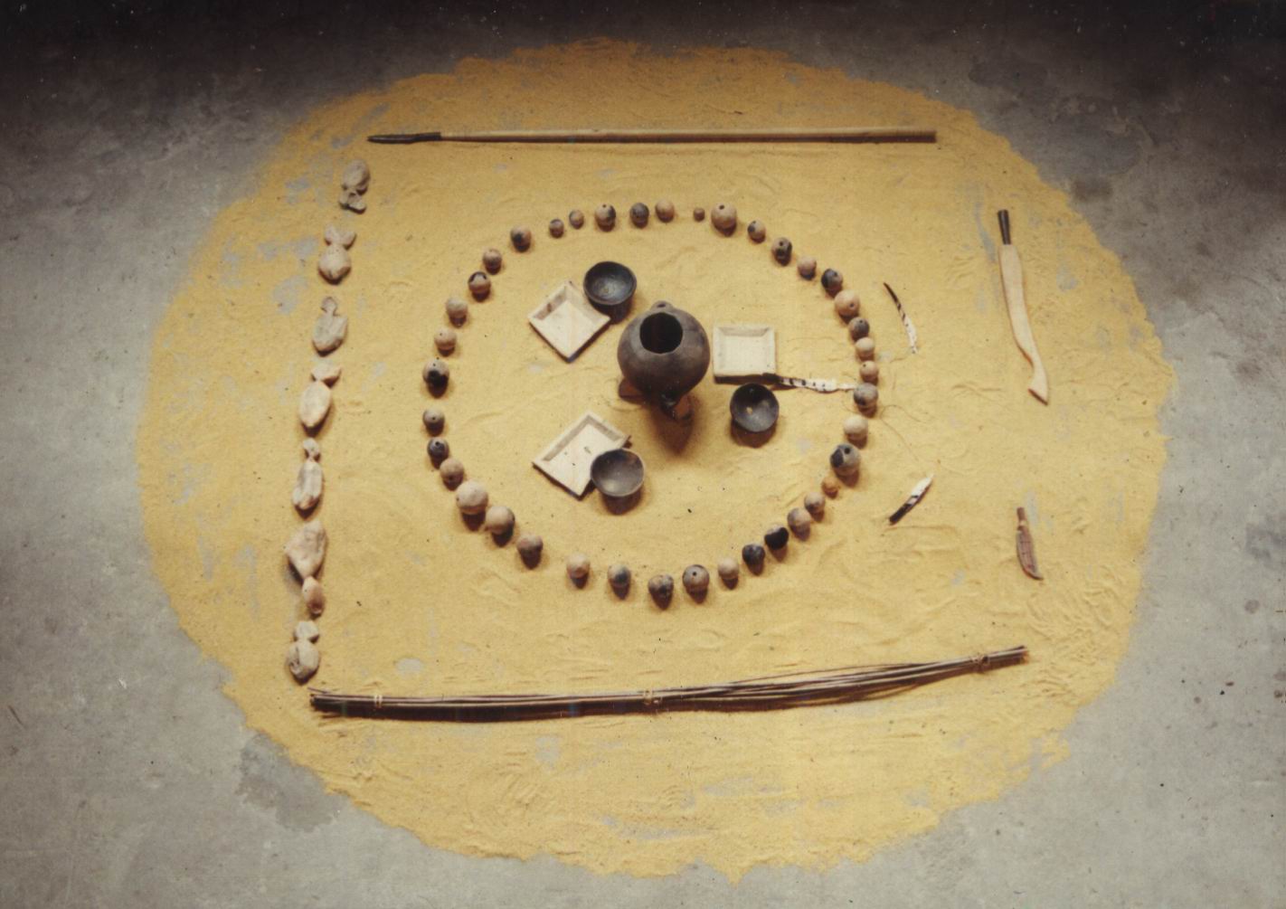 Made from Argil and driftwood, he arranged utensils, accessories, and millet into an array to symbolize the idea of how a tribe could exist and sustain.