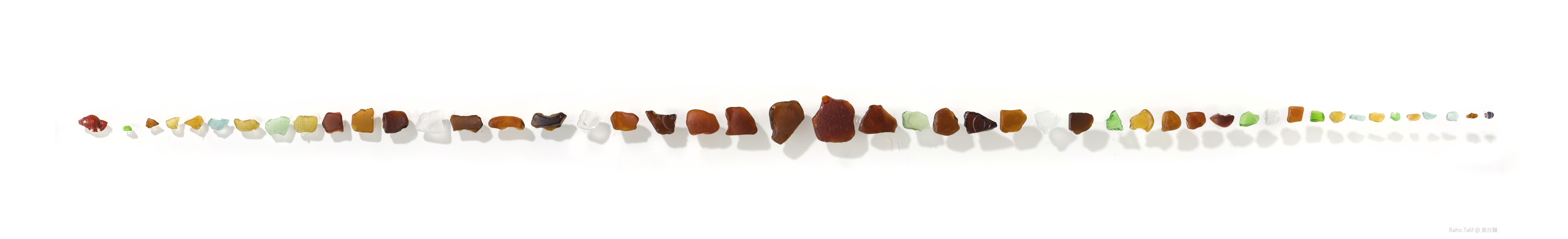 這些廢棄物消失在原本的生活場域轉而在岸邊堆積的不堪景象,與太平洋壯闊的風光看似對立卻又不得不彼此依存。它們破碎的銳角劃破時空預言式的顯露對未來處境的侵蝕,卻又因長期在風浪中滾動、圓滑、褪色而擬態出一種近似於超越衝突的妥協,然而這樣的偽裝卻在抽撿過程中隨即放射出強烈的訊息,控訴著曾經揚棄他們的文明,以及正在被消耗殆盡的歷史與環境。